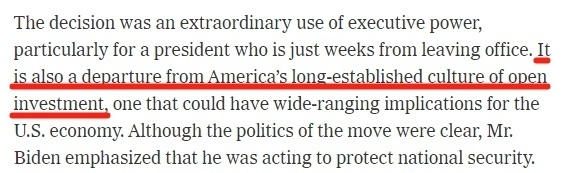 美国《纽约时报》评论称,拜登作出阻止交易的决定,背离了美国开放的投资文化,可能对美国经济产生广泛影响。