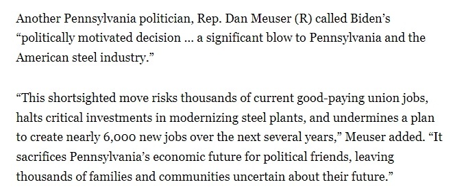 据美国《政治报》网站报道,宾夕法尼亚州的共和党籍国会议员丹·穆泽批评拜登“出于政治动机的决定……对于宾夕法尼亚州和美国的钢铁产业都是重大的打击”。穆泽还警告说,“这将阻碍对钢厂进行现代化改造的关键投资,破坏在未来数年内创造近6000个新工作岗位的计划”。